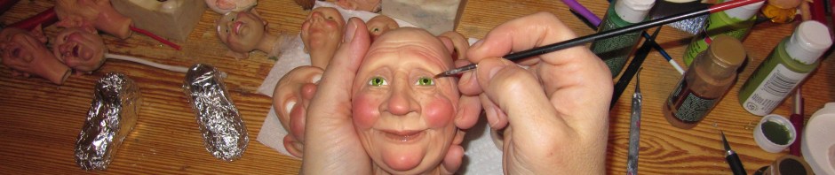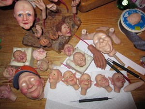 Here’s a picture of my work shop with the original sculptures for the new elves and Santa as well as some other body parts. These are what the original sculptures look like before they are cast in resin. You can see a couple of older elf faces sitting in  silicone rubber molds in the middle and left hand side of the photo. Along the bottom are the original sculptures of the five new elf faces.  I actually sculpted a dozen faces, but these are the ones that made the cut.