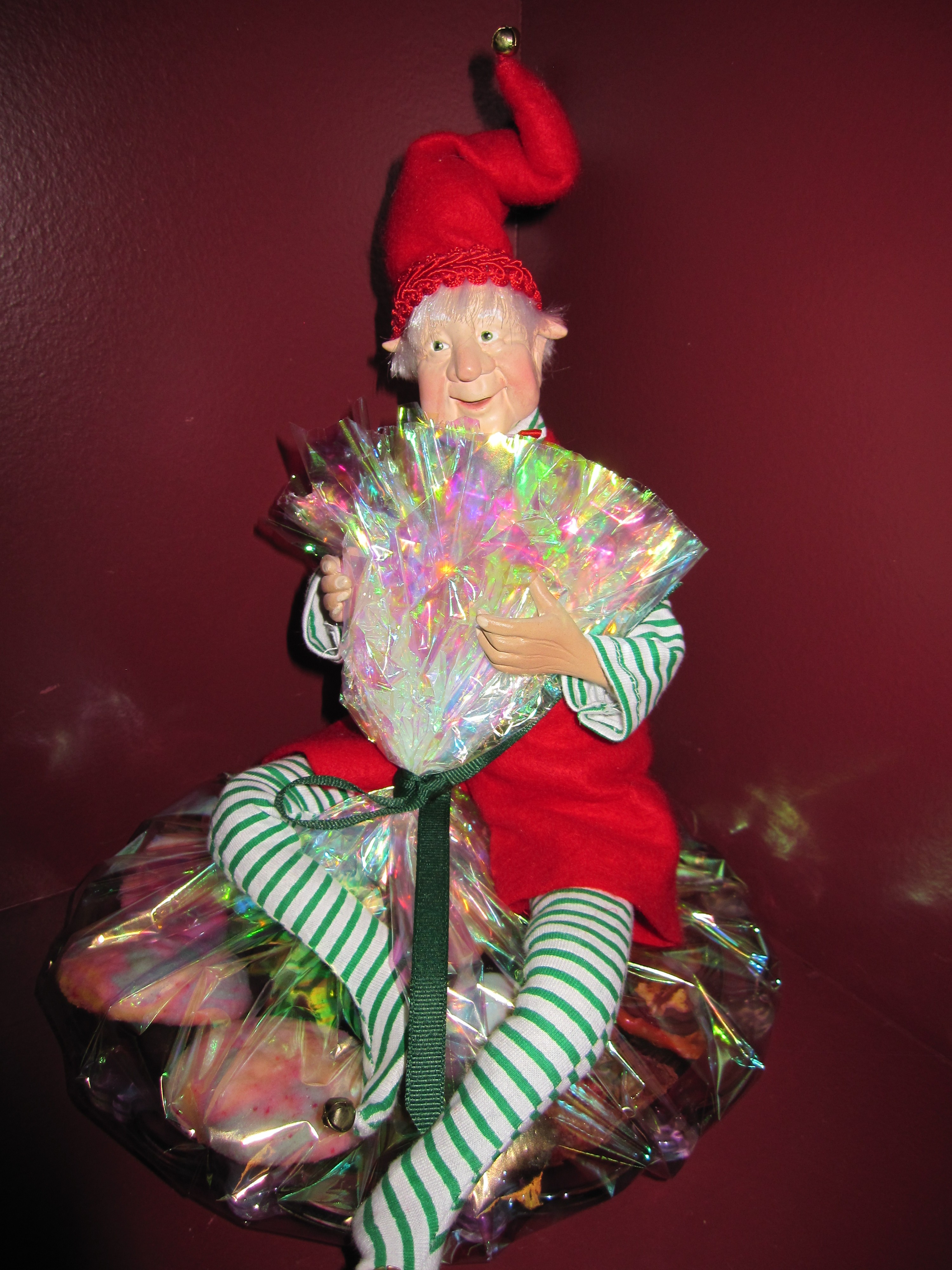 Party season is fast approaching and if you’re like me, I always find myself scrambling to put together a hostess gift at the last minute. One thing I like to do is bake – so I always have an assortment of cookies in the freezer ready to go if I need to put a cookie tray together quickly. This idea works well with store bought cookies or even a box of chocolates. To make my goodies stand out I always include a cookie elf either holding the tray or package or part of the arrangement. Here’s a picture of Albert sitting right on top of the plate of cookies holding the cellophane together. This presentation is fun to put together, but it’s even more delightful to receive.