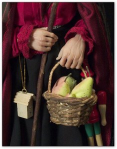 On the left is a close-up of the hand detail on this original one-of-a-kind sculpture. This version of La Befana is my interpretation of a more benevolent northern Italian Befana.