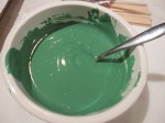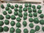 Just before you take them out of the freezer, melt some green candy coating in your microwave. Drop a few balls at a time into the candy coating and roll around. Gently lift them out and place on a parchment lined cookie sheet. Because the balls are cold the coating will set right away. You can go back and add some flourish with swirls and criss-cross patterns. Enjoy!