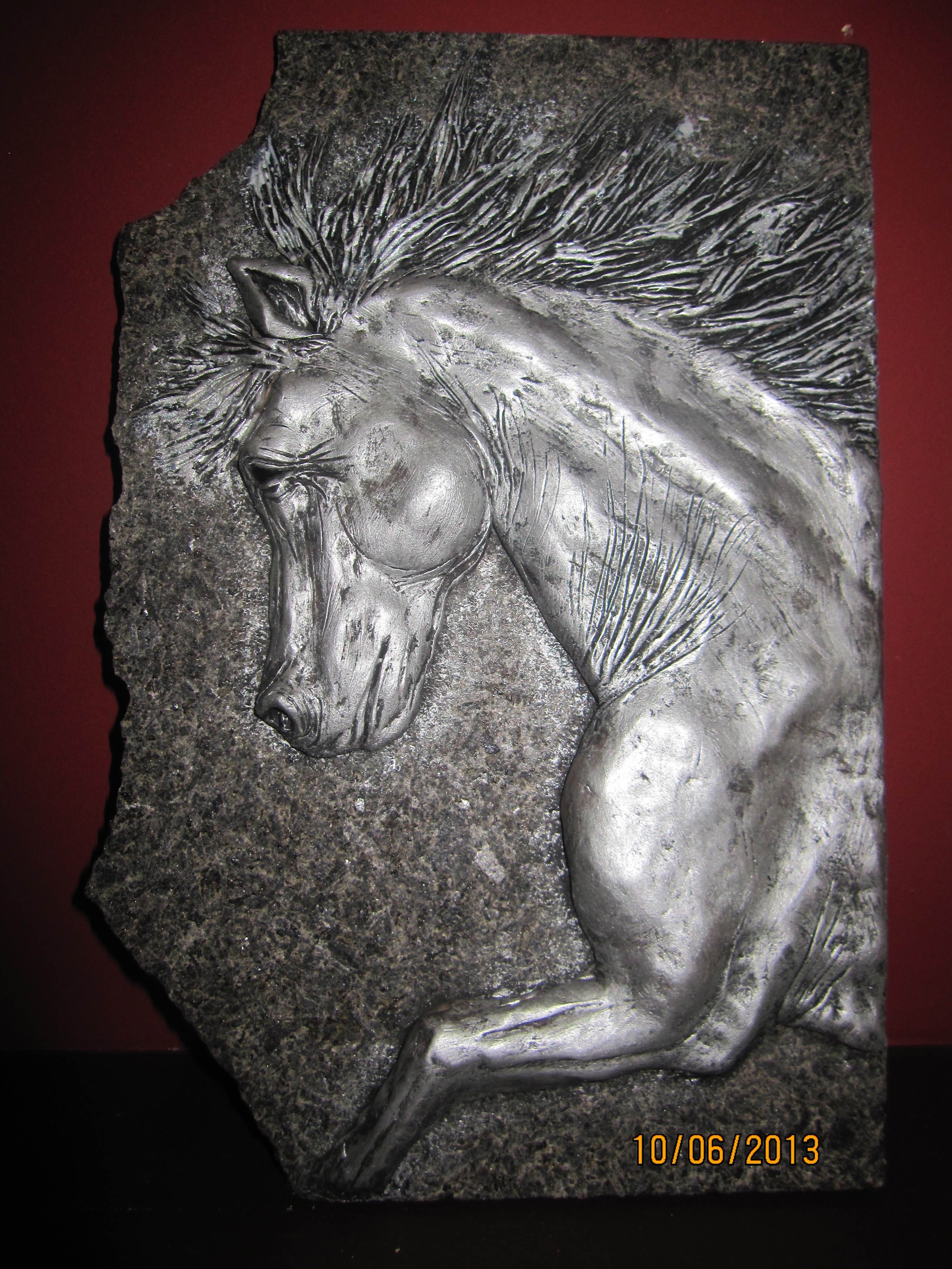 The western tradition of sculpture began in Ancient Greece. There are two basic kinds of sculpture – free standing such as statues, and the various types of relief which are attached to a background surface. Relief is classified by the degree of projection from the background and is referred to as low bas-relief or high relief. This horse is an example of a bas-relief sculpture I did on a limestone background.