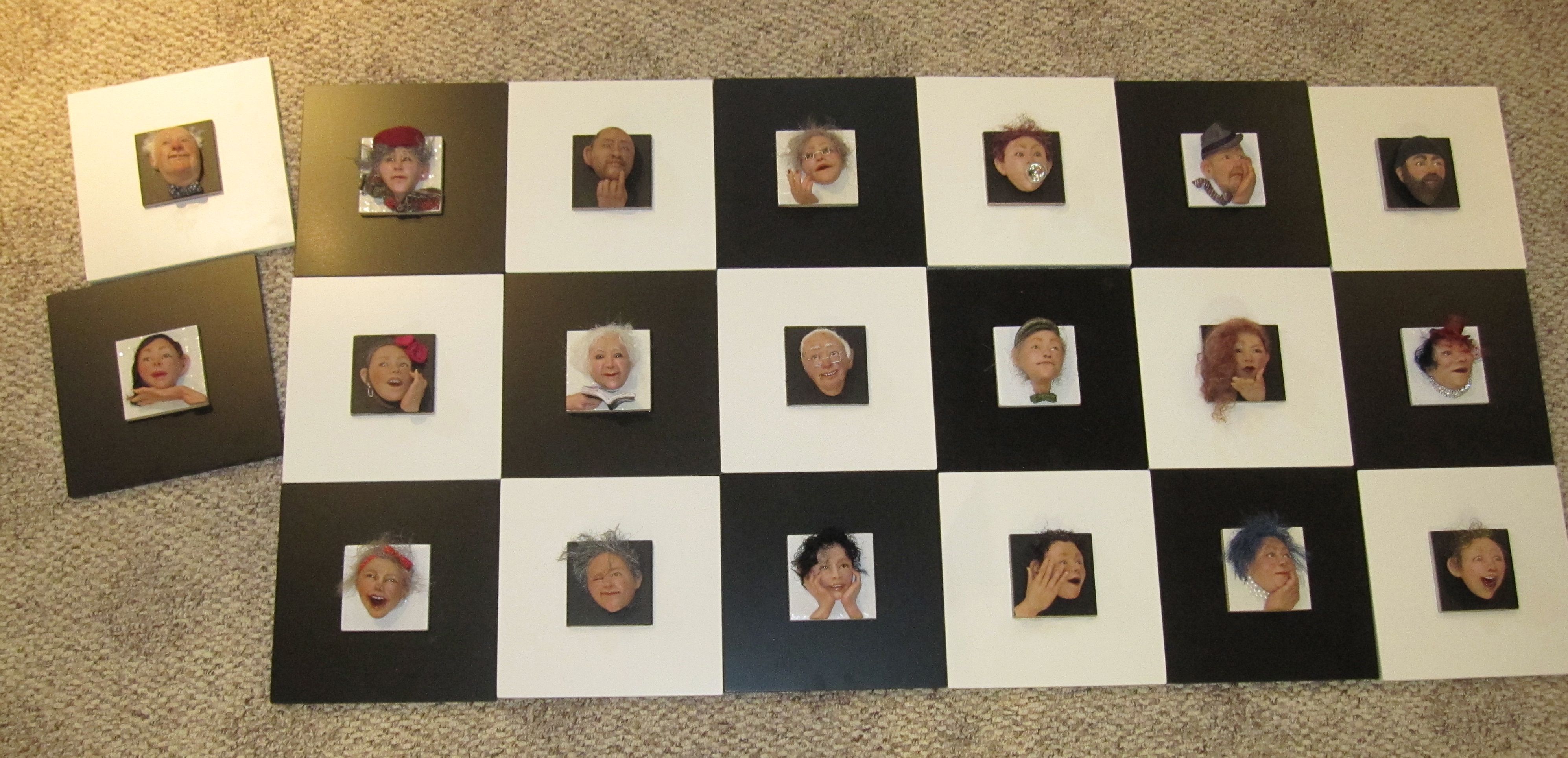 Also included in the exhibit is a series of 20 relief sculptures called “Study of Expression”. Here’s a picture of the series, but it’s even better in person. Each portrait is sculpted directly on a tile that sits in a 10″ x 10″ frame. Whimsical characterizations of the people in our lives, if you have the opportunity to visit the gallery you’ll probably recognize some of them. There’s even an example of a portrait commission in this series.