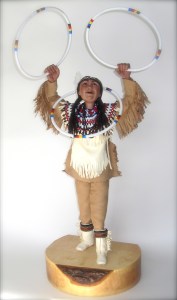 My contribution to this year’s Wabano Gala is “The Hoop Dancer”. She stands approximately 28″ tall. Her face, hands and feet are sculpted from polymer clay and her costume is made from textiles, leather and suede. Her costume is enhanced by a hand-beaded collar and accessories. Her hoops are painted with the 4 sacred colours and she stands on a polished maple base.