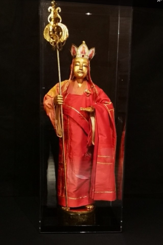 robe shown here is in a soft yellow orange hue, lined in cream silk. The traditional Kasaya is made from a deep orange/red Dupioni silk divided into 13 sections trimmed in gold. I had to learn the correct way to fold and wrap his body. The clasp is also made from polymer and gold leaf. I created the staff from scrolled wood and covered it in 24-karat gold leaf. It holds 12 metal rings. His crown is created from paper, polymer clay, resin and gold silk trim.