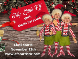 If you want to try your hand at making your own original elf, check out AforArtistic.com for my online workshop called “My Little Elf”. No experience is necessary. Registration is open now. Once you register you’ll have access to the supply list so you can get ready. The class begins on November 13th. Once it is released you can download it and follow at your own pace. I warn you – you can’t just make one – you’ll want to make more to keep and to give away. Check it out at https://www.aforartistic.com/my-little-elf