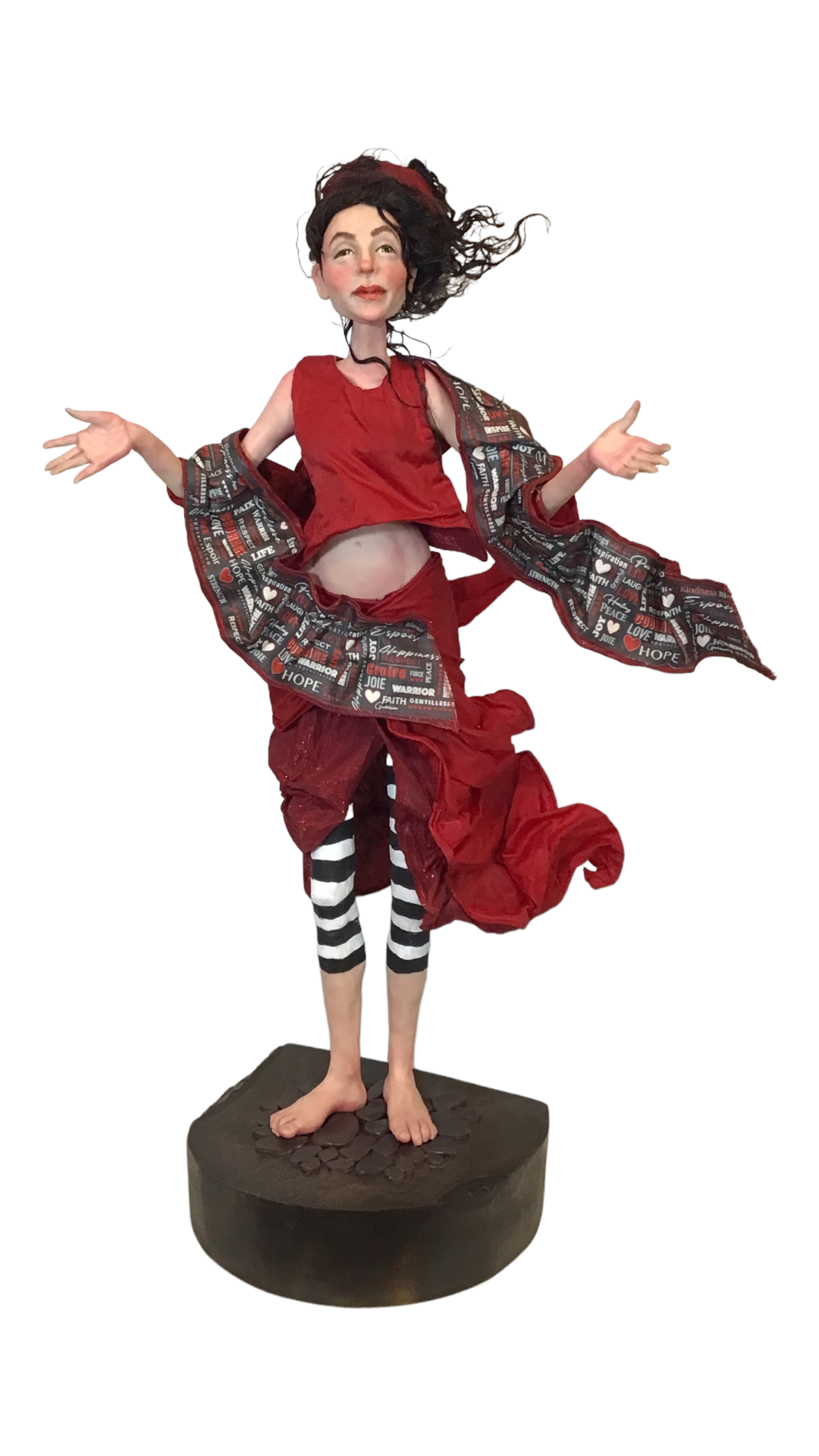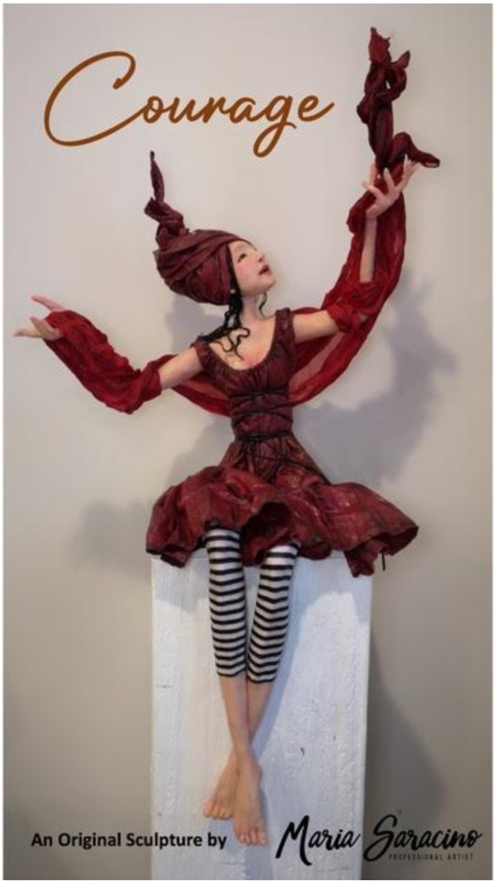 Let’s get back to the Red Dress Gala. The challenge last year was to create a special figurative sculpture that embraced the “Red Dress” theme with the key word being “Courage”. Here is a photo of my submission. “Courage” was a big hit with the audience and after a quick and lively auction brought in $3,000 for the cause. Not only that, but she won the “Social Consciousness’ award in an international art competition and was featured in two Art Doll publications last year.