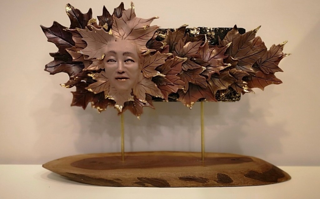 “Spirit of Fall“ – polymer clay, gold leaf, brass and wood