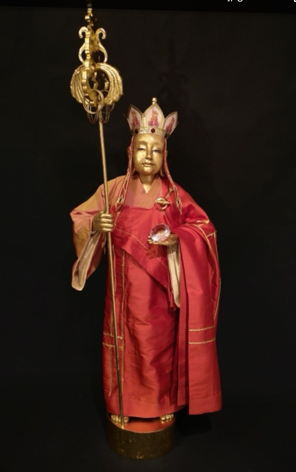 This is Buddha, a sculpture that took me almost 4 months to complete. It is my client’s offering to his temple. A large piece, 34″ tall, sculpted in polymer clay but guilded in 24-karat gold leaf. The robes are made from three colours of Dupioni silk. The under robe shown here is in a soft yellow orange hue, lined in cream silk. The traditional Kasaya is made from a deep orange/red Dupioni silk divided into 13 sections trimmed in gold. I had to learn the correct way to fold and wrap his body. The clasp is also made from polymer and gold leaf. I created the staff from scrolled wood and covered it in 24-karat gold leaf. It holds 12 metal rings. His crown is created from paper, polymer clay, resin and gold silk trim.