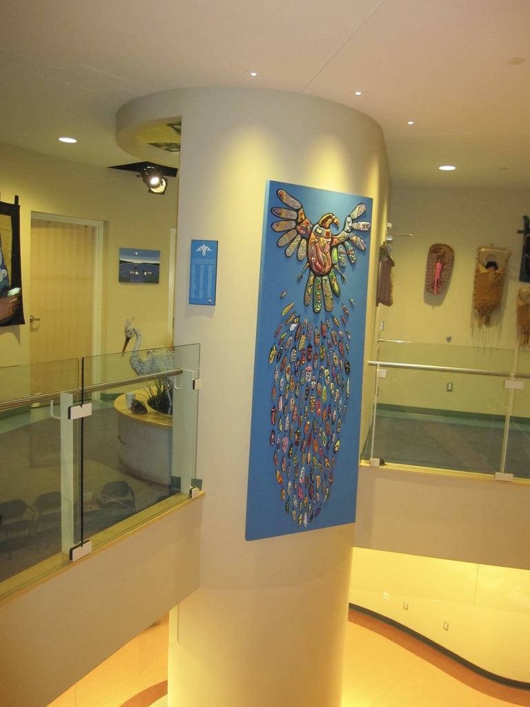 Designed as a community project together with the Wabano Centre, this 8′ x 3′ mural was a collaboration between myself, the staff at the Wabano Centre and 125 participants who each made one of the feathers cascading from the Thunderbird.
